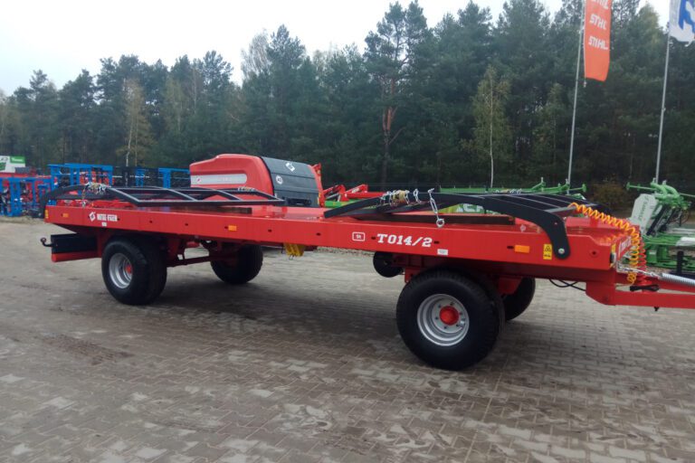 PRZYCZEPA PLATFORMOWA DO BEL T009 Metal-Fach – ładowność 11 440 kg – pojemność 32/34 liczba bel – 2 ruchome burty zaokrąglone – łańcuchy podtrzymujące burtę – hamulec postojowy ręczny – ogumienie 400/60-15,15 lub 500/50 R17 Przyczepa platformowa do bel T014/2…