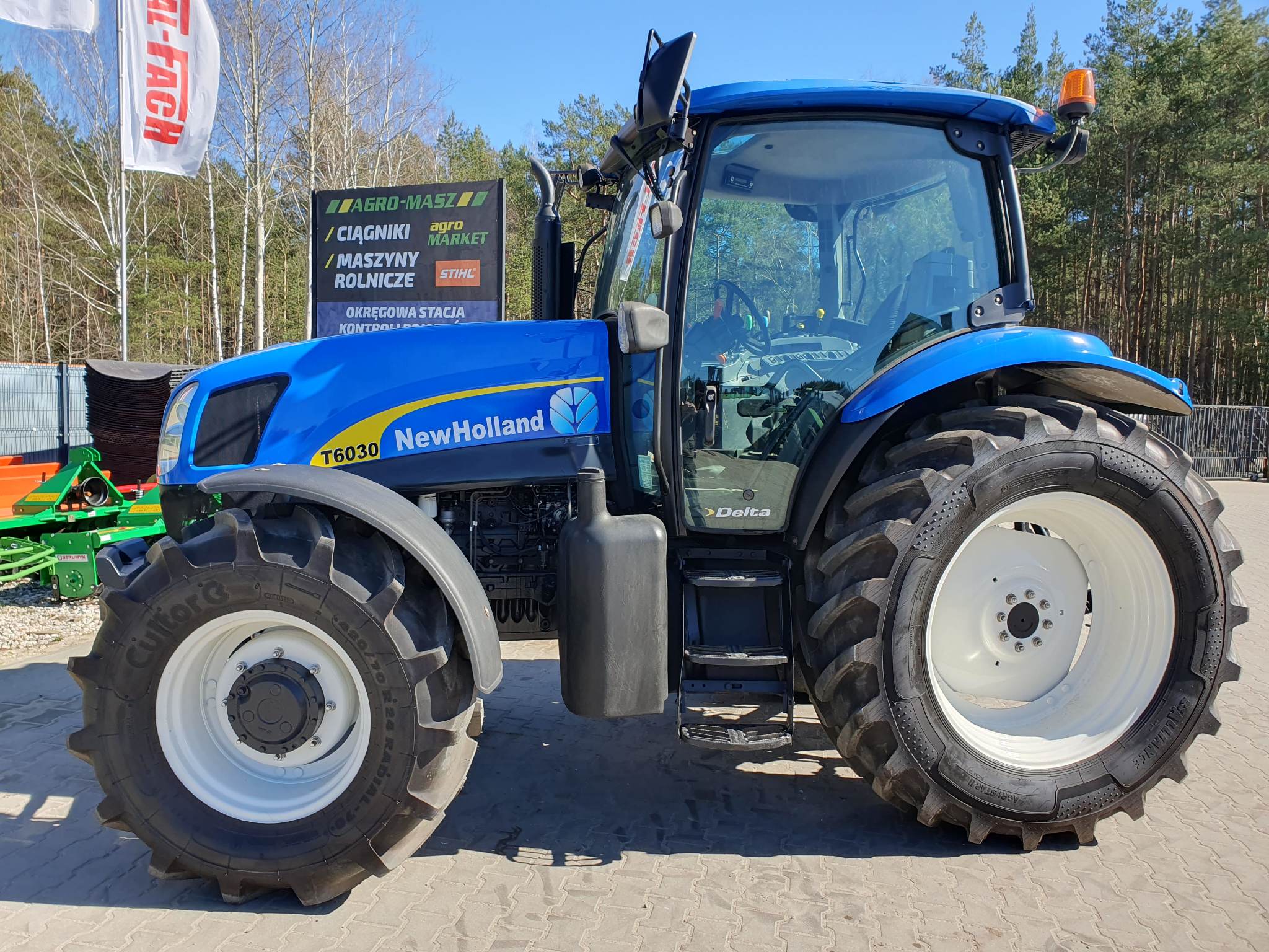Ciągnik rolniczy New Holland T6030 – silnik 6-cio cylindrowy o mocy 117KM – rok produkcji 2007 – 10005 mth – klimatyzacja – radio – fotel operatora pneumatyczny – fotel pasażera – ogumienie przód 420/70 R24 – ogumienie tył 480/70 R38 – WSZYSKIE 4 OPONY NOWE